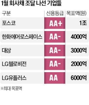 1호 발행사인 포스코가 수요예측에 성공하자 기업들의 회사채 발행 작업도 활기를 띠고 있다. 이달 한화에어로스페이스, 대상, LG헬로비전, 미래에셋증권, LG유플러스 등이 발행에 나선다.