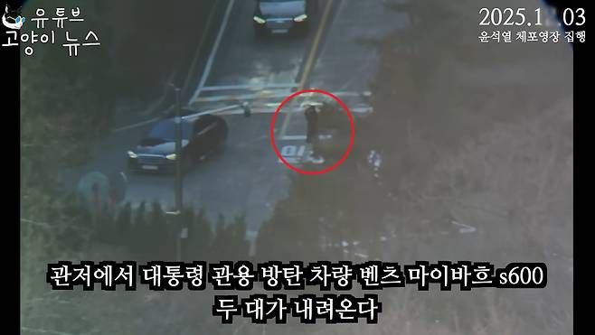 4일 유튜브 채널 '고양이뉴스'는 3일 오전 8시 28분 서울 용산구 한남동 대통령 관저에서 대통령의 관용 방탄차 벤츠 마이바흐S600 두 대가 내려오고 이어 경호처 직원으로 보이는 인물이 손을 올려 경례를 하는 모습 등을 2분 53초짜리 영상으로 올렸다.