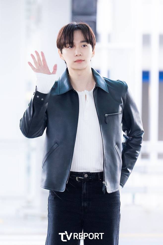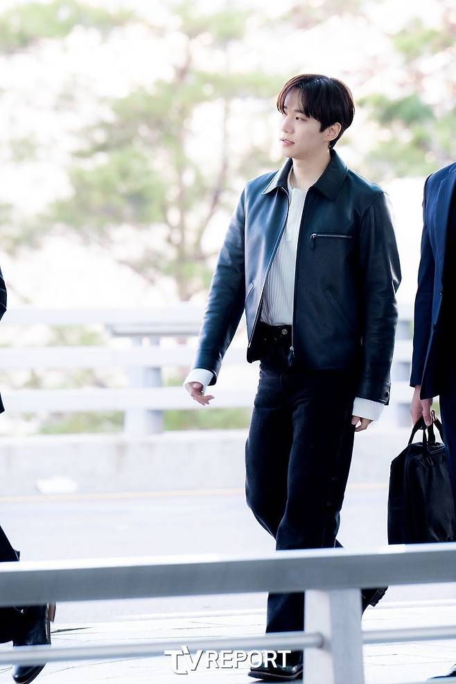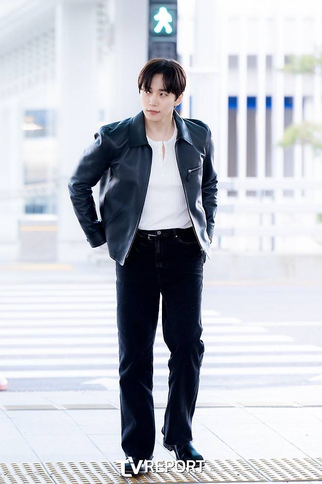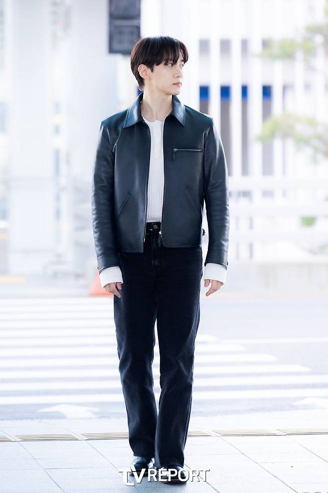 2PM 출신 배우 이준호도 가죽 레더 재킷을 활용한 코디를 선보였다.
