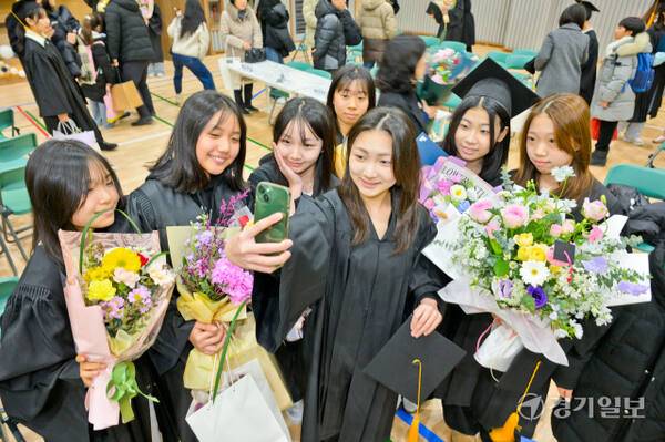 6일 오전 수원특례시 장안구 한일초등학교에서 열린 졸업식에서 졸업생들이 친구와 함께 사진을 찍으며 초등학교 마지막 추억을 남기고 있다.