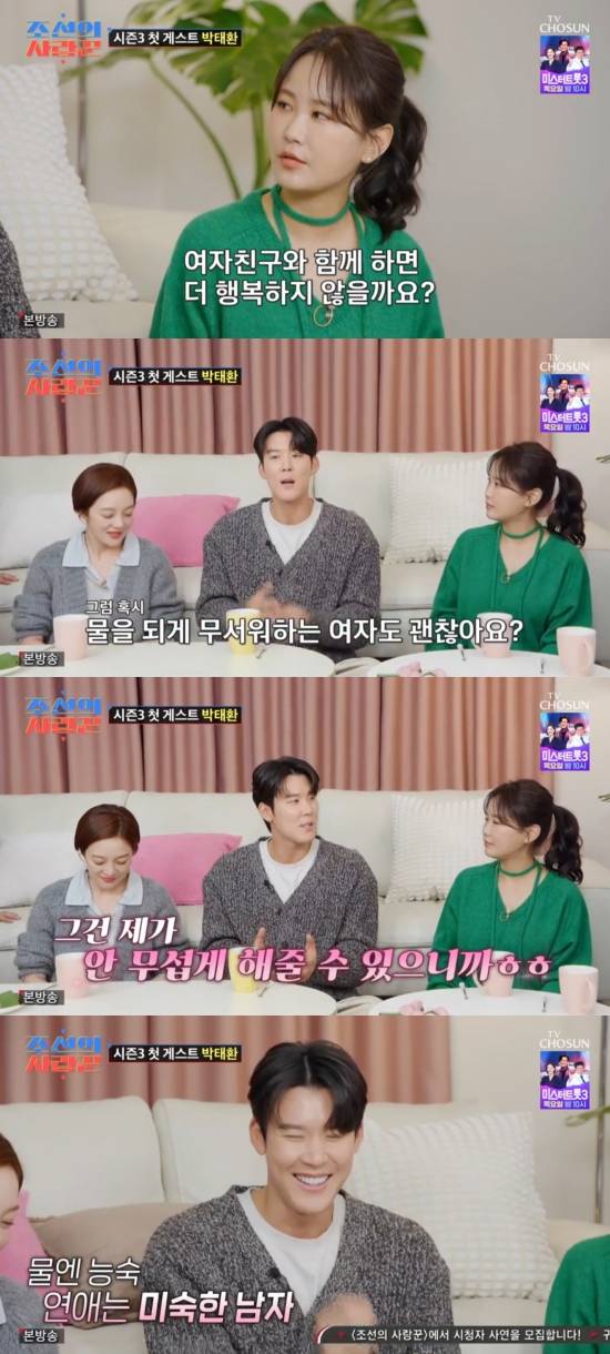 김지민은 "물을 되게 무서워하는 여자도 괜찮냐"라며 관심을 나타냈고, 박태환은 "그건 제가 안 무섭게 해 줄 수 있으니까. 제가 물에 능숙한 사람이니까. 근데 연애는 능숙하지 않으니까"라며 자신감을 드러냈다. 김지민은 "그럼 연애 고수고 물 무서워하는 사람으로 소개해 주겠다"라며 너스레를 떨었다.