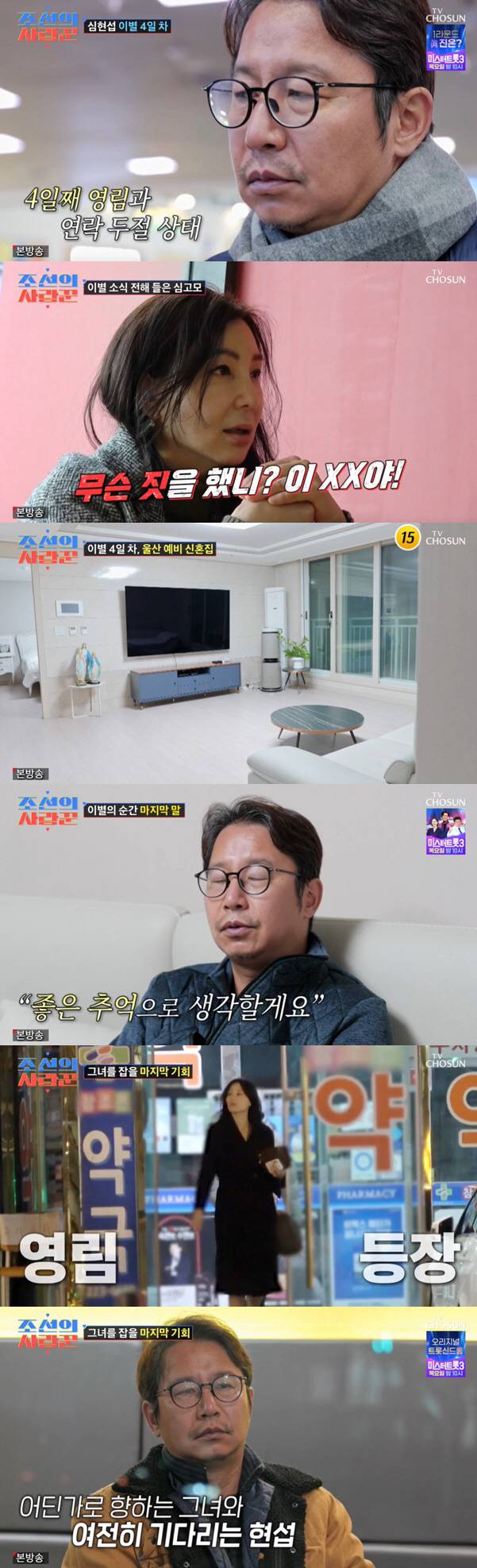결국 이별 4일차, 심현섭은 계속 연락이 안되는 영림씨를 만나기 위해 울산으로 향했다. 사실 심현섭은 영림씨에게 확신을 주기 위해 울산에 신혼집까지 구했었다고. 심현섭은 영림씨와의 마지막 통화에 대해 "싸우다가 전화를 끊은게 아니고 '좋은 추억으로 생각할게요'라고 하더라. '잘 지내시고 밥 꼭 챙겨먹어요'라고 하더라. 오히려 그렇게 얘기하고 마무리되니까 더 슬프더라"라고 털어놓았다. 심현섭은 여자친구의 집 근처까지 가서 기다렸지만 끝끝내 만나지 못했다.