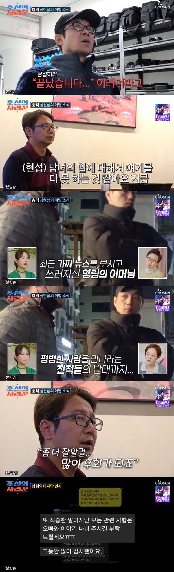 이후 제작진과 만난 심현섭은 이별 소식을 직접 전했다. 넋이 나간 채 울산에서 서울로 올라온 그는 "방금 마지막으로 통화 한번 했다"면서 "완전히 끝난 관계다. 주말에 서울에서 행사가 있어서 울산에 못간적 있다. 2주만에 본 적도 있다. 그럴때 말도 안되는 가짜뉴스까지 나오니까..영림이가 상황 적으로 저에게 지친 것 같다"고 헤어지게 된 사연을 털어놨다. 그러면서 "저도 사람이니까 남녀의 일에 대해서 얘기를 다 못하겠다. 자칫 잘못 얘기하면.."이라고 말을 아끼는 모습을 보였다.