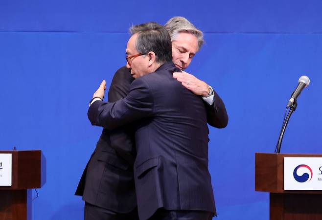 | 블링컨 美국무, 계엄사태후 첫 방한 “한미동맹 흔들림 없어” 조태열 외교부 장관(오른쪽)과 토니 블링컨 미국 국무장관이 6일 오후 서울 종로구 외교부 청사에서 한미 외교장관 회담 후 공동 기자회견을 마친 뒤 포옹하고 있다. 계엄 사태 이후 처음 방한한 블링컨 장관은 “한국의 친구로서 미국은 한국 민주주의의 저력을 완전히 신뢰한다”고 말했다. 뉴시스 |