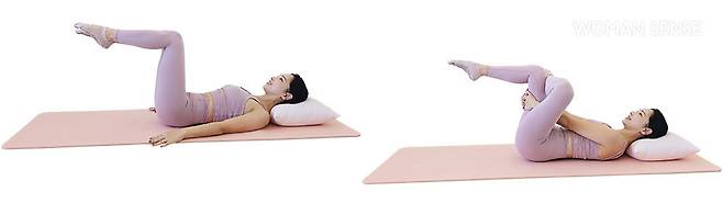 2 한쪽 다리를 가슴 앞쪽으로 구부리고 무릎을 가슴 가까이 끌어당긴다.