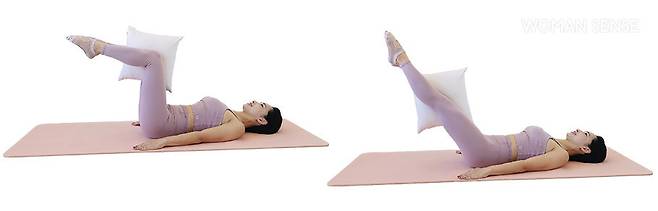 2 내쉬는 호흡에 허벅지 힘으로 쿠션을 조이면서 다리를 사선으로 뻗는다.