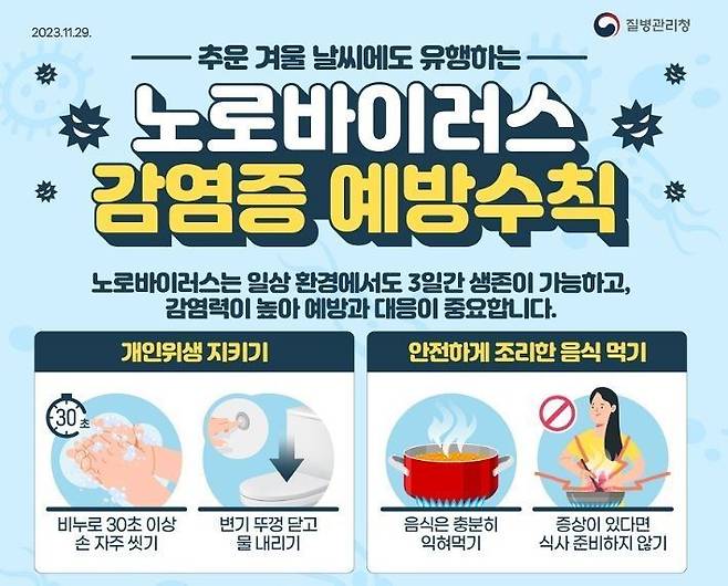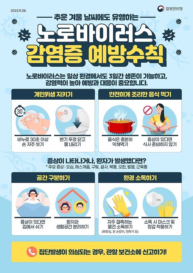 지영미 질병관리청장은 “노로바이러스감염증을 예방하기 위해 올바른 손씻기 등 예방수칙 준수와 안전하게 조리한 음식 섭취를 당부한다"면서 "특히 영유아 보육시설에서는 유증상자 등원 자제와 환자 사용 공간 소독을 강조하며, 집단환자 발생 시 가까운 보건소로 신고해달라"고 밝혔습니다.