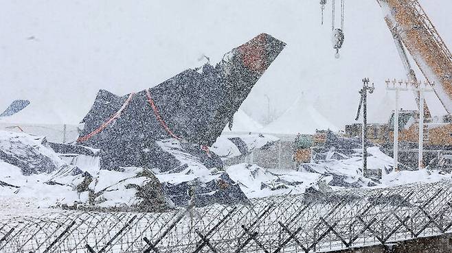 ▲ 제주항공 여객기 참사 열흘째인 7일 전남 무안군 무안국제공항 사고 현장에 눈이 내리고 있다.