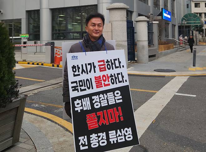 | ▲ 류삼영 전 총경이 2024년 12월 13일 경찰청 국가수사본부 앞에서 국회의장이 파견 경찰을 지휘하도록 해 줄 것을 요구하는 1인 시위를 하고 있다. |