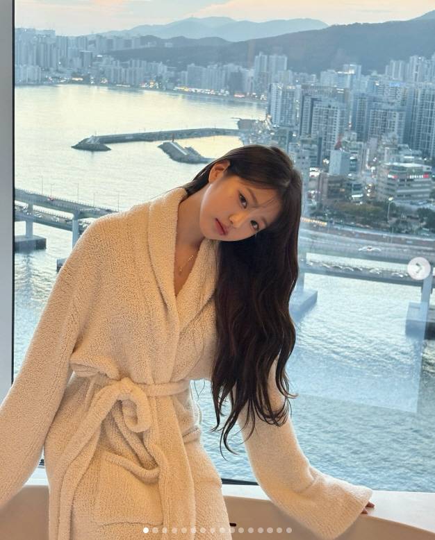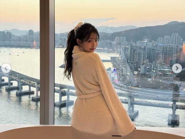장원영이 공개한 사진은 강뷰가 아름다운 숙소에서 샤워가운을 입고 욕조 위에 걸터 앉아서 다양한 포즈를 선보이고 있다.