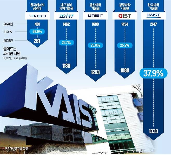 의대 증원에 따라 공대 인재 궁핍 상황이 현실화할 조짐이다. 최고 과학 인재가 모이는 KAIST 등 4개 과학기술원의 2025학년도 정시 지원자가 지난해 대비 급감한 것으로 나타났다. 의과대학 정원이 한꺼번에 1509명 늘어나자 최상위권 학생이 대거 의약학계열로 몰렸기 때문이다. 올해 정시 의대 지원자는 6년 만에 1만 명을 넘어섰다. 고급 두뇌를 키우는 과학기술원까지 ‘의대 증원 후폭풍’에 휩싸이자 미래 과학기술 인력 확보에 비상이 걸렸다는 우려가 나온다.