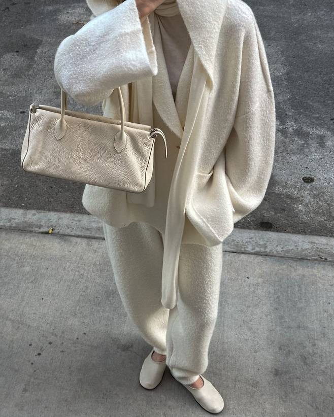 때론 넉넉한 사이즈의 니트를 어깨와 목에 두르는 것이 더욱 따뜻하고 스타일리시해 보입니다. 패션 인플루언서 사라의 룩이 평범하지만 결코 지루하지 않은 건 어깨에 두른 화이트 니트와 바라클라바 덕분이죠.