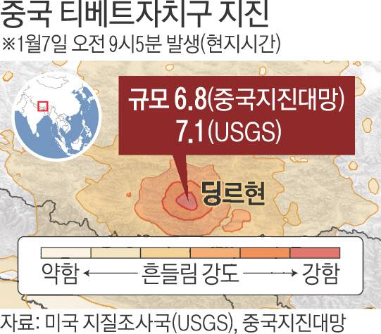 중국지진대망에 따르면 이날 오전 9시5분쯤 시짱자치구 제2의 도시인 르카쩌시(티베트어 지명은 시가체) 딩르현(북위 28.50도·동경 87.45도)에서 규모 6.8의 지진이 발생했다. 진원 깊이는 10㎞이다.