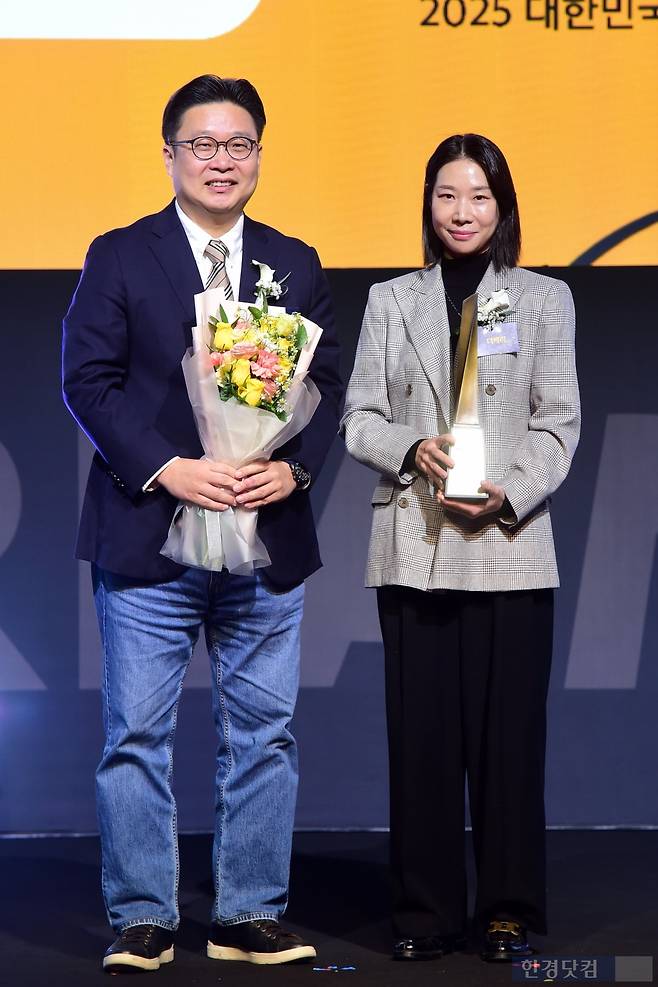 한국소비자브랜드위원회가 주최하고 한국경제신문사와 한국소비자포럼이 공동 주관한 '2025 대한민국 퍼스트브랜드 대상 시상식'이 7일 오후 서울 장충동 신라호텔에서 열렸다. 유아동복 부문을 수상한 더캐리(브랜드명 베베드피노) 고경희 부장(오른쪽)이 서경덕 한국소비자포럼 소비자위원장과 포즈를 취하고 있다.