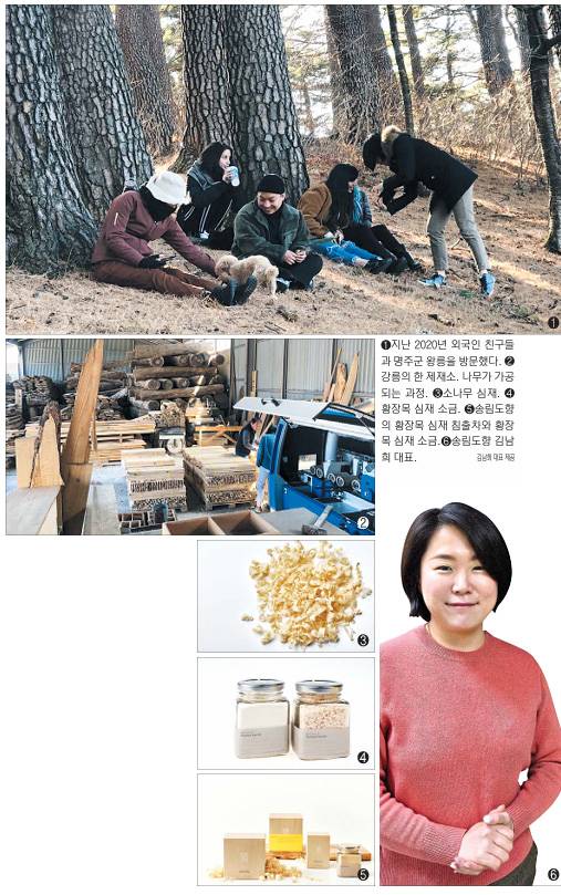 얇게 말린 소나무 심재에 코를 가져다대니 진한 나무향이 났다. 고즈넉한 사찰이 떠오르는 향이었다. 심재를 물에 우려내니 향이 더욱 진해졌다. 차 한 모금을 입에 머금으니 마음이 차분해졌다. 강릉에 사는 김남희(38) 씨가 만든 소나무 차다. 그는 수령 100년 이상의 소나무 ‘황장목’의 향에 매료돼 활용 방안을 찾았다. 고민 끝에 소나무 침출차, 소나무 소금, 소나무 숙취해소제를 개발했다. 강릉 대전동 강릉과학산업진흥원에 위치한 김남희연구소에서 남희 씨를 만났다. 그는 “호기심만으로는 강원도 살이가 녹록지 않을 것”이라면서도 “어느 지역보다 가능성이 무궁무진하다”고 평가했다.