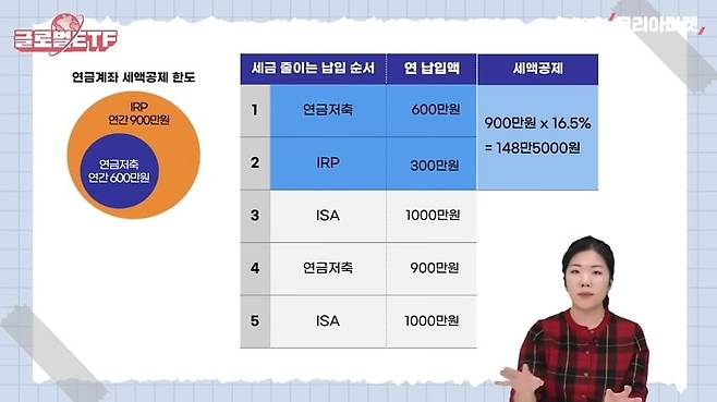 하나하나 살펴볼게요. 일단 세제혜택을 가장 많이 받을 수 있는 계좌는 연금저축과 IRP에요. 두 개 합쳐 1년에 900만원까지 최대 16.5%를 곱한 148만5000원을 연말정산에서 돌려주죠. 그래서 이걸 제일 먼저 채우는 게 세금을 제일 많이 줄일 수 있습니다. 그런데 연금저축은 1년에 600만원까지만 세액공제를 해줘요. 그래서 먼저 연금저축에 600만원을 채우고, 그다음 IRP에 300만원을 넣어서 총 900만원의 세액공제 한도를 맞춰 넣는게 제일 유리합니다.