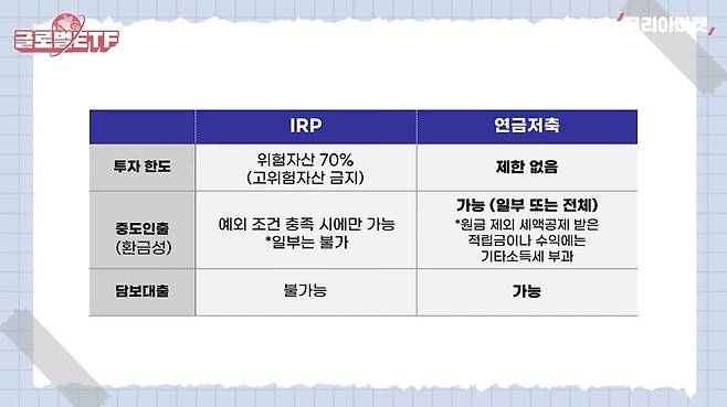 연금저축을 먼저 채우라고 말씀드리는 이유는 1. 연금저축은 투자할 때 IRP처럼 위험자산에 70%까지만 투자할 수 있다 이런 한도가 없어서 더 자유롭게 투자할 수 있고요. 2. 환금성이 더 좋습니다. 만약에 나중에 너무 돈이 급해서 연금을 깨야할 때도 연금저축은 일부만 해지할 수 있는 반면에, IRP는 특별한 사유가 있어야 하고, 계좌 전체 금액을 한번에 해지해야합니다. 또 연금저축은 돈이 급하면 이걸 담보로 대출을 받을 수 있는 상품이 있는데, IRP는 대출상품이 없어요. 연금은 55세까지는 안 깨야지 하고 넣는거지만, 사람 일 모르잖아요. 환금성 면에서 연금저축이 더 유리합니다.