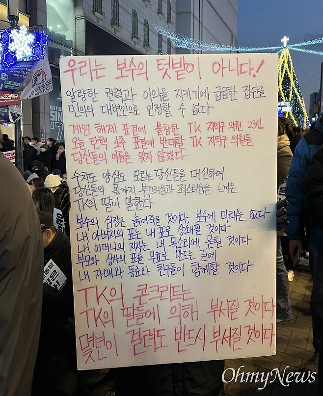 윤석열 대통령이 비상계엄을 선포한 '12.3 내란 사태'에 전국의 많은 시민들이 거리로 나왔다. '보수의 텃밭'이라거나 '보수의 심장'으로 불리는 대구에서도 연일 수많은 시민들이 거리로 쏟아져 나와 '윤석열 탄핵'과 '국민의힘 해체'를 외쳤다.