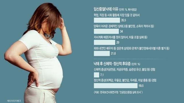 앞선 사례들은 낙태한 여성들이 당면한 씁쓸한 자화상이다. 2022년 한국보건사회연구원이 발표한 ‘인공임신중절 실태조사’에 따르면 여성들이 낙태 후 자궁유착증, 습관성 유산 등 신체적 증상을 겪는 경우는 7.1%, 죄책감과 자살 충동 등 정신적 증상을 경험한 경우는 59.5%로 조사됐다. 또 낙태 관련 정책에 대해 국가가 해야 할 과제로는 ‘원치 않은 임신을 예방하기 위한 성교육 및 피임 교육’(24.2%), ‘피임·임신·출산에 대한 남녀 공동 책임 의식 강화’(21.5%) 등의 순서로 나왔다.
