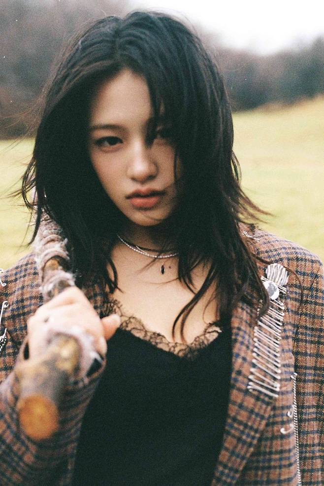안유진은 걸크러쉬를 자랑했다. 나뭇가지를 들고서 강렬한 눈빛을 내뿜었다. 자연과 어우러지는 체크무늬 재킷, 데님 바지를 소화했다.