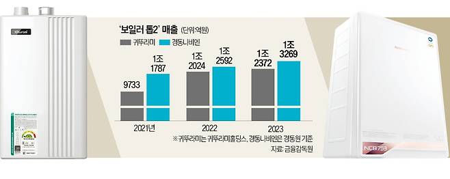 신사업 분야 실적도 올해 맞수 열전의 관전포인트다. 난방용품을 제외한 두 회사의 신사업 영역은 다르다. 귀뚜라미는 2006년부터 귀뚜라미범양냉방·신성엔지니어링·센추리 등 냉방공조 기업을 인수하며 ‘종합 냉난방 에너지그룹’으로 사업 영역을 다각화했다. 2023년 말 귀뚜라미그룹 매출 가운데 냉방계열사가 차지하는 비중이 41%에 달했다. 이를 기반으로 2030년 매출 3조원을 달성하겠다는 게 목표다.