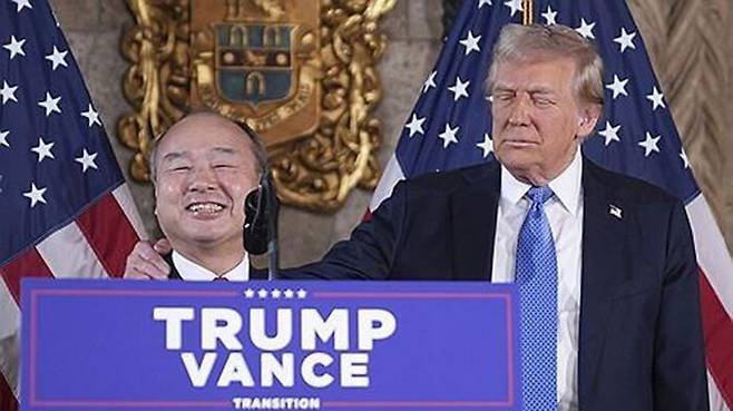 ▲ 지난달 16일 트럼프 당선인 옆에서 투자 계획 발표한 손정의(좌)