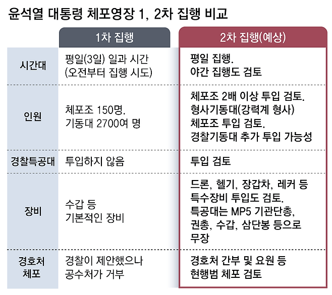 공수처는 1차 집행 때와 같이 평일에 집행하되 대통령경호처의 빈틈을 노리기 위해 야간에 기습적으로 집행하는 방안도 검토 중인 것으로 알려졌다. 또 1차 때 150명을 투입한 체포조에 서울경찰청 형사기동대를 투입해 체포조를 두 배 이상으로 늘리는 방안도 거론된다.