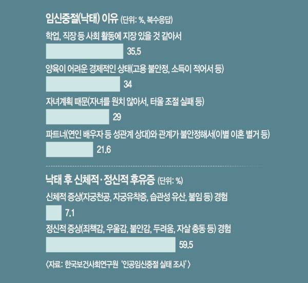 앞선 사례들은 낙태한 여성들이 당면한 현실이다. 2022년 한국보건사회연구원이 발표한 ‘인공임신중절 실태조사’에 따르면 여성이 낙태 후 자궁유착증, 습관성 유산 등 신체적 증상을 겪는 경우는 7.1%, 죄책감과 자살 충동 등 정신적 증상을 경험한 경우는 59.5%로 조사됐다. 또 낙태 관련 정책에 대해 국가가 해야 할 과제로는 ‘원치 않은 임신을 예방하기 위한 성교육 및 피임 교육’(24.2%), ‘피임·임신·출산에 대한 남녀 공동 책임의식 강화’(21.5%) 등이 꼽혔다.
