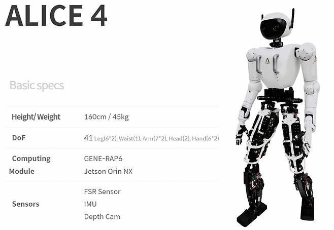 특히 앨리스는 인간과 함께 살아가는 휴머노이드의 세상을 만들겠다는 비전을 실현하기 위해 설계·제작됐다. 다양한 환경에서 임무수행이 가능하도록 손을 이용해 물체를 조작하는 임피던스 컨트롤, 비전 인식 기반으로 주변 환경을 살피고 판단하는 온디바이스AI를 갖췄다.