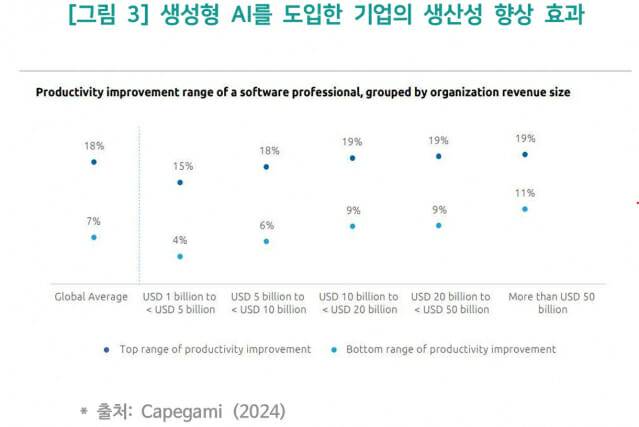 생성형 AI는 초급 개발자들에게 양날의 검이 되고 있다. 맥킨지 보고서에 따르면, 생성형 AI는 개발자의 생산성을 빠르게 증가시킬 수 있으며, 특히 코드 문서화, 코드생성, 코드 재구성 등의 작업에서 20-50%의 작업 시간 절감률을 보인다. 반면 캡제미니의 설문조사에서는 생성형 AI 이니셔티브를 활발하게 도입한 조직이 그렇지 않은 조직보다 SW 개발주기 전반에서 생산성이 78% 향상된 것으로 나타났다.