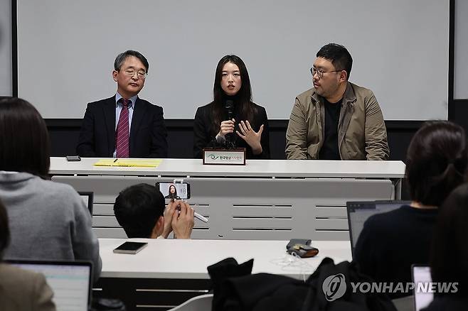 (서울=연합뉴스) 임화영 기자 = 기독교복음선교회(통칭 JMS) 총재 정명석의 여신도 성폭행 피해자인 메이플 씨가 9일 오후 서울 서초구 한국콘퍼런스센터에서 열린 정명석에 대한 대법원 17년형 선고 관련 기자간담회에서 소회를 밝히고 있다.