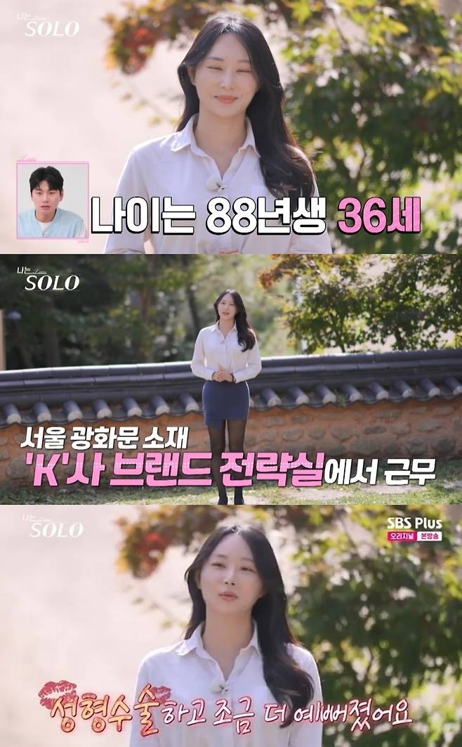 이날 매력적인 외모로 출연자들의 시선을 끈 24기 옥순은 1988년생이며 'K'사 브랜드 전략실에서 일하고 있다고 소개해 감탄을 불렀다. 36세로 보이지 않는 동안 외모와 대기업에 재직 중이기 때문.