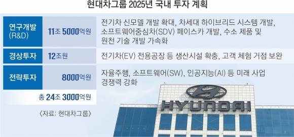 현대자동차그룹이 올해 국내에서만 역대 최대 규모인 24조원을 투자한다. 탄핵 정국과 미국 도널드 트럼프 2기 행정부 출범 등 대내외적 불확실성과 BYD 등 중국 전기차 업체들의 저가 공세에 직면해 ‘통 큰 투자’로 시장을 선도하겠다는 전략으로 풀이된다. 친환경차 제품 경쟁력을 강화하고 차세대 소프트웨어중심차(SDV) 같은 미래 제품군 개발에 재원을 쏟아붓는다.