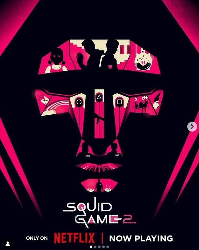 함께 공개된 일러스트 포스터에는 프론트맨의 가면에 '오징어 게임'의 상징인 영희, 돼지 저금통, 핑크 가드, 회전목마에 이어 222번 준희(조유리 분)과 333번 명기(임시완)의 실루엣이 담겨 눈길을 끈다.
