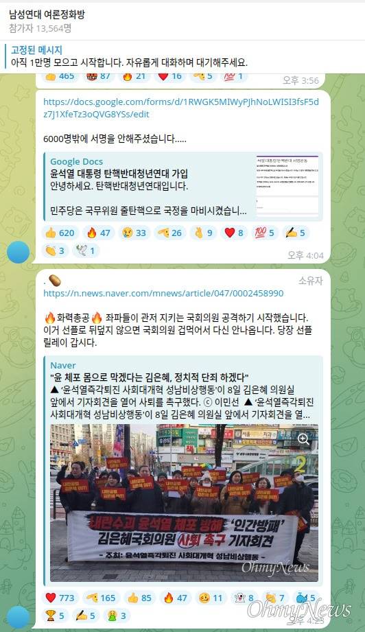 9일 <오마이뉴스> 취재에 따르면 윤석열 대통령을 지지하는 '신남성연대'는 올해 1월부터 '남성연대 여론정화방'이라는 이름의 텔레그램 단체 채팅방을 운영하고 있다. 이 채팅방 관리자는 윤 대통령 관련 기사를 공유하면서 기사 댓글 중 대통령 비판 댓글에는 '비추천'을 누르고, 대통령 지지 댓글에는 '추천'을 누르도록 유도하고 있다. 네이버 댓글의 경우 추천수에 따라 상단에 노출되는 댓글들이 달라지는데, 추천수 조작을 통해, 윤석열 지지 댓글이 우선적으로 보이게끔 하는 것이다.