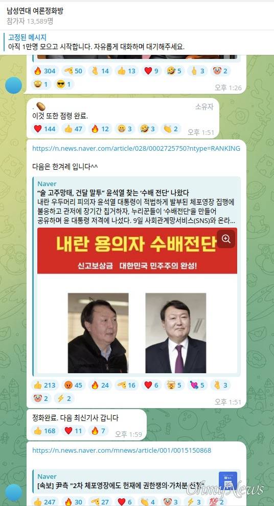 내란수괴 피의자인 윤석열 대통령을 지지하는 극단주의 단체가 단체 채팅방을 만들어 네이버 뉴스 기사에 윤석열을 지지하고, 민주당 등을 비방하는 댓글을 추천하는 여론전을 펼치는 것으로 확인됐다.