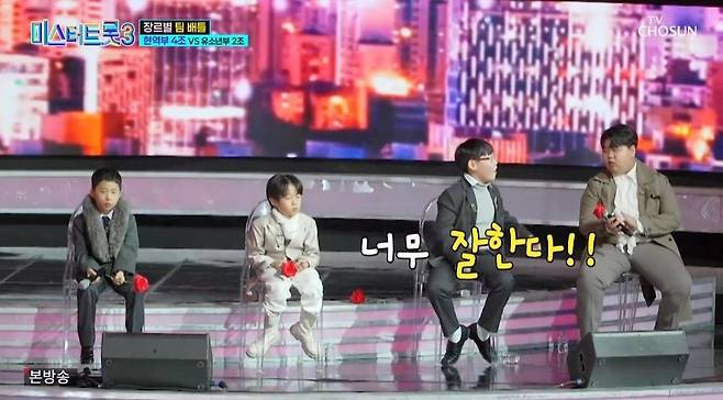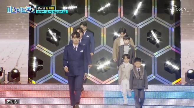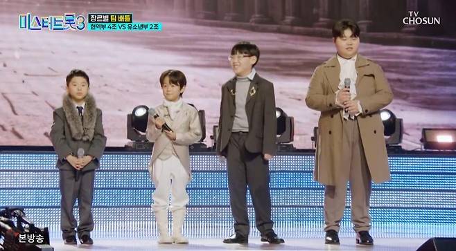 9일 방송된 TV조선 예능 프로그램 '미스터트롯3'에서는 장르별 팀배틀에서 현역부 4조와 유소년부 2조가 맞붙었다.
