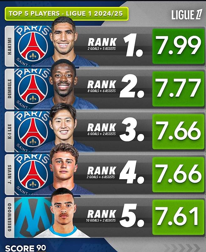 이강인은 축구콘텐츠 매체 스코어90이 선정한 이번 시즌 리그1 전반기 선수 순위 3위에 오르는 기염을 토했다. 선발과 교체를 오가는 들쭉날쭉한 기회 속에서도 일궈낸 성과여서 더욱 놀랍다.