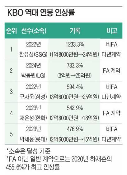 다만 하재훈의 기록적인 연봉 인상률이 가능한 건 직전 시즌 연봉이 워낙 적었기 때문이다. 2006년 MVP와 신인왕을 동시 석권한 류현진(한화 이글스)은 이듬해 연봉이 전년 대비 400% 수직 상승(2000만원→1억원)했는데 당시 신인 최저 연봉자여서 인상 폭이 클 수밖에 없었다. 김도영처럼 억대 연봉에서 400% 이상 인상된 건 전례를 찾기 힘들다.