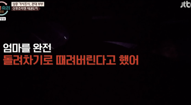 집으로 돌아가는 길. 아이는 엄마의 힘든 모습이 보였는지 “엄마 힘들게 하지마라 엄마 구출하겠다”고 말할 정도.엄마를 제일 힘들게 하는 사람에 대해 “한 명 있다 아빠”라고 말하면서“아빠가 나쁜말 한다. 엄마를 완전 돌려차기로 때려버린다더라”고 했다.아내가 없을 때 아이들에게 한 말인 것. 아이들은 이미 많은 욕설을 기억하고 있었다.