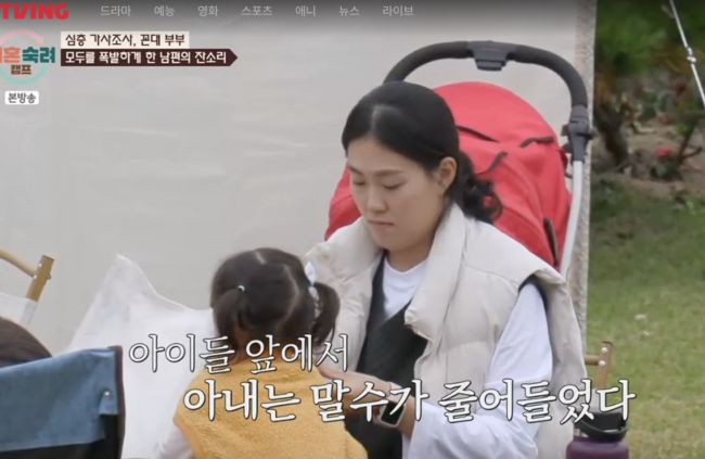 그 사이 남편 성화에 캠핑을 나오게 된 가족이 그려졌다. 남편은 아내가 빵을 봉지에 가져왔다며 시작부터 잔소리를 폭발, 아이 앞에서 엄마인 아내를 무시하는 말이 계속됐다. 아이들도 엄마를 호통치는 아빠에게 “하지마라”고 외칠 정도.서장훈은 “정말 충격적이다“라고 말했다. 아내는 “말이 길어지지 않으려면 제가 입을 다물어야한다”며 묵묵히 혼자 다 치우고 있었다.그 사이 아빠 잔소리에 귀를 막는 아이들은 “또 왜 엄마한테 화내냐”고 했다. 그런 모습을 보여주지 않기 위해 아내는 아이 앞에서 말수가 줄었던 것.