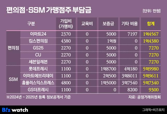 규모와 형태가 더 비슷한 SSM과 비교하면 킴스편의점의 창업비용은 낮은 편이다. 가장 최근 등록된 정보공개서를 기준으로 홈플러스익스프레스의 가입비는 4800만원, 보증금은 1억5000만원이다. 롯데슈퍼(롯데프레시)는 가입비와 보증금이 각각 1100만원, 1억8700만원이다. 이마트에브리데이도 가입비 1100만원, 보증금 2억500만원을 받는다. 모두 킴스편의점보다 높다.