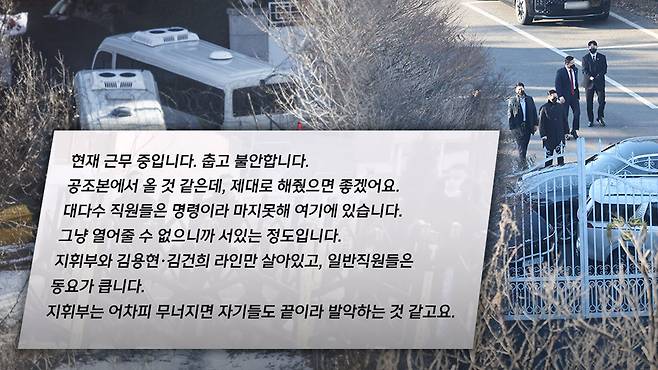 MBC라디오 '김종배의 시선집중'에서 공개한 편지에서, 익명의 한 경호처 직원은 "현재 근무 중이다. 춥고, 불안하다. 공조본에서 올 것 같은데, 제대로 해줬으면 좋겠다"면서 "지휘부와 '김용현·김건희 라인'만 살아있고, 일반 직원들은 동요가 크다"고 적었습니다.
