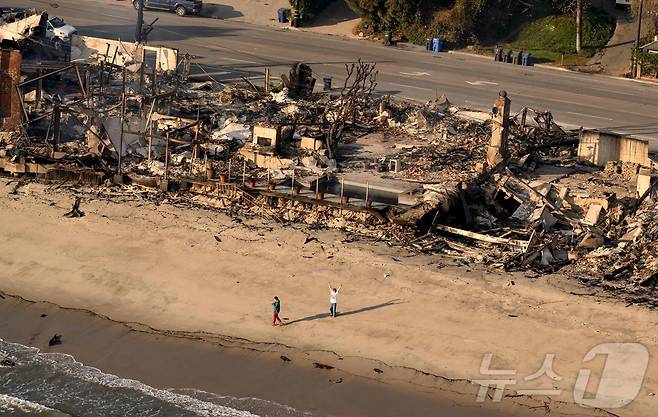 (말리부 AFP=뉴스1) 우동명 기자 = 9일(현지시간) 팰리세이즈 산불이 휩쓸고 간 캘리포니아 로스앤젤레스 인근의 말리부 해안에서 불에 탄 주택들이 보인다. 2025.01.10