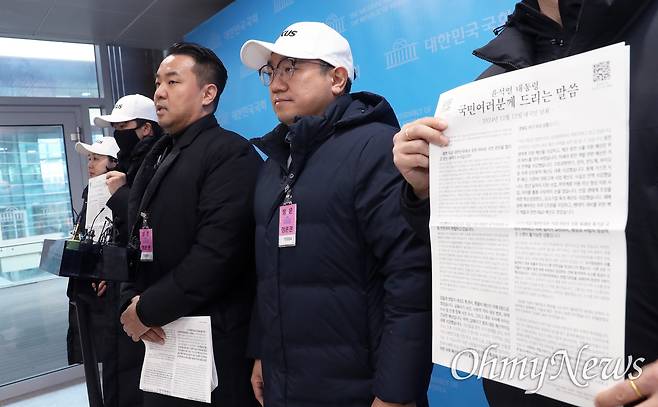 | ▲ 9일 오후 서울 여의도 국회 소통관에서 김민전 국민의힘 의원은 "오늘은 반공청년단을 기자회견에서 소개해드리려고 한다. 이들은 왜 살을 칼로 에는 듯한 바람 속에서도, 눈보라가 휘날리는 밤에도 밤을 지새우며 한남동에서 시위를 하고 있는지 그들의 목소리를 여러분께 전해드리려고 한다"며 '반공청년단'을 소개했다. |
