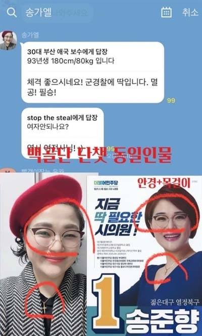 대구 출신인 송씨는 "제가 2018년 지방선거에서 민주당 소속으로 대구광역시 시의원 후보로 출마한 것은 맞다"면서도 "하지만 홍준표 당시 자유한국당 대표의 정치적 행보에 동의하지 못해 민주당으로 출마했을 뿐, 저는 집안부터가 정통 TK 보수우파"라고 말했다.