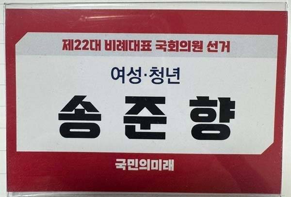 | ▲ 실제로 송씨는 국민의힘에서 정치적 활동을 이어왔다. 2023년에는 김기현 당시 국민의힘 당대표 후보의 선거캠프에서 미디어 특보로 임명되었고 2024년에는 국민의미래 비례대표 예비후보자로 등록해 면접까지 봤다. 사진은 예비후보자 당시 송씨가 패용한 명찰. |