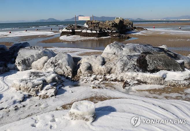 (부산=연합뉴스) 강선배 기자 = 올겨울 들어 가장 추운 날씨를 보인 10일 부산 다대포해수욕장에 밀물로 들어온 바닷물이 강추위로 꽁꽁 얼어붙어 눈이 내린 듯하다. 이날 부산지역 최저기온이 영하 10.1도까지 떨어지고 강풍까지 불어 체감온도는 이보다 더 낮았다. 2025.1.10