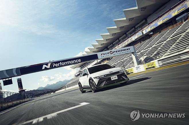 (서울=연합뉴스) 현대자동차가 10일 일본 도쿄 마쿠하리 멧세 컨벤션센터에서 열린 일본 최대 자동차 튜닝 박람회 '2025 도쿄 오토살롱'에서 '아이오닉 5 N DK 에디션'을 공개했다고 밝혔다. 사진은 일본 시즈오카 후지 스피드웨이 서킷에서 아이오닉 5 N DK 에디션이 주행하는 모습. 2025.1.10 [현대자동차·기아 제공. 재판매 및 DB 금지]