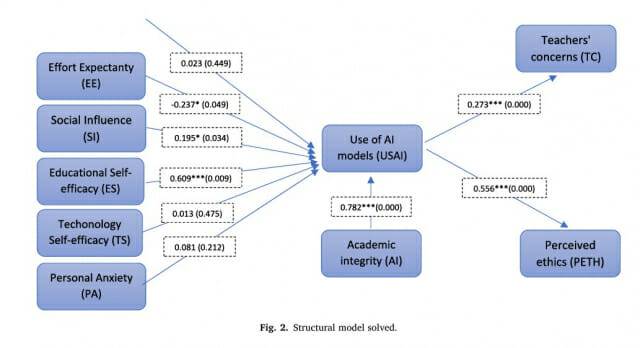 연구 참여자의 상세 구성을 보면 독립 연구자가 33.3%(100명), 교수 및 시니어 연구자가 5.7%(17명), 박사 후 연구원이 1.3%(4명), 연구 관리자가 0.3%(1명)를 차지했다. 연구진이 설정한 9개의 가설 중 6개가 통계적으로 지지됐다. 특히 주목할 만한 결과로 사용 용이성에 대한 기대감(EE)이 AI 활용에 부정적 영향(β = -0.237)을 미치는 것으로 나타났으며, 학문적 진실성은 가장 강한 긍정적 영향(β = 0.782)을 보였다. 사용 용이성에 대한 기대감은 구체적으로, 사용자가 AI 모델을 배우고 활용하는 데 필요한 노력 수준을 얼마나 쉽게 인식하는지를 나타낸다. 연구에 따르면, EE가 낮을수록, 즉 AI 모델이 더 쉽게 사용 가능하다고 느낄수록 사용 의도가 증가한다.